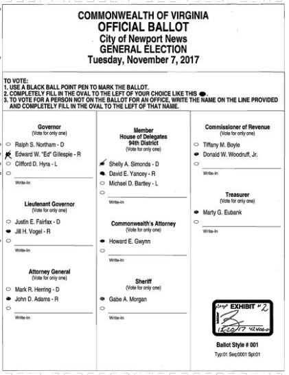 A December 19 recount gave Simonds a one-vote victory over Yancey, out of nearly 24,000 votes cast. But the panel of judges who met to certify the results the next day decided that a ballot in which the bubbles for both candidates were filled in, but the bubble for Simonds was then crossed off, should be counted as a vote for Yancey because the voter chose Republicans in the other races on the ballot. (See ballot below)