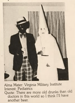 The yearbook page is headlined with Northam’s name and contains two pictures of Northam, along with a third photo in which one man is wearing blackface and another is dressed in Ku Klux Klan regalia.