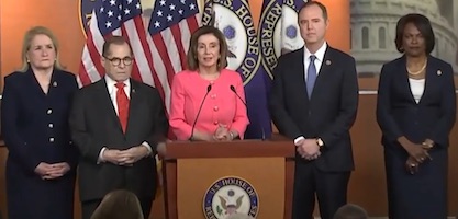 House Speaker Nancy Pelosi unveils impeachment managers with Sylvia Garcia at far left and Val Demings at far right. (From Washington Post Live)