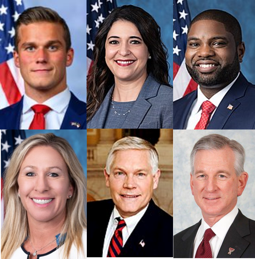 Clockwise from top left: Cawthorn, Bice, Donalds, Tuberville, Sessions, Greene