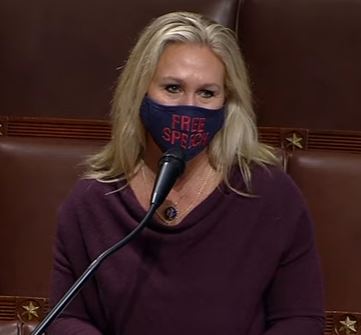 While both the House and Senate were observing coronavirus precautions, including masks and social distancing, one new member from Georgia, Marjorie Taylor Greene, was spotted on the floor without a mask, prompting admonishment by House staff.